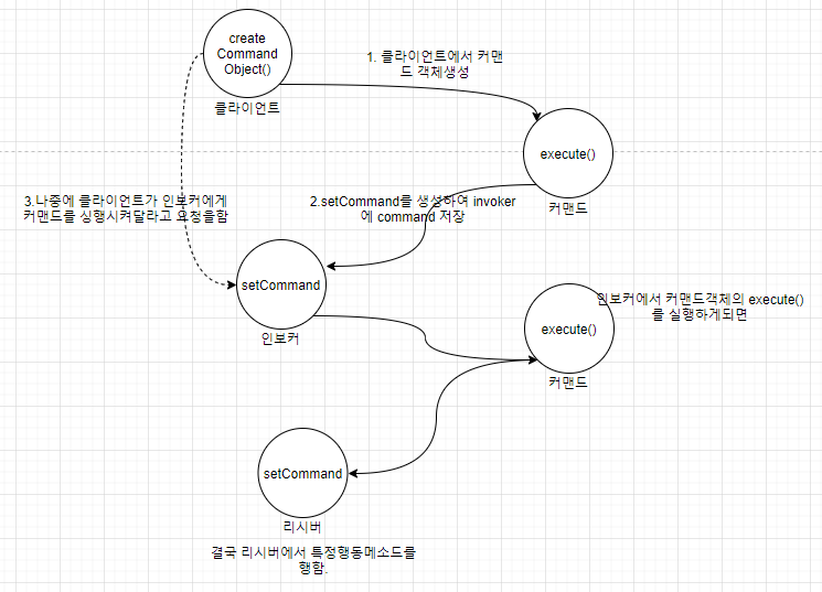 - 위와같이 command내부 execute command 안에는 여러개의 Receiver에 로직이 들어갈 수 있다. (원하는 행동을 구동시키기 위하여)